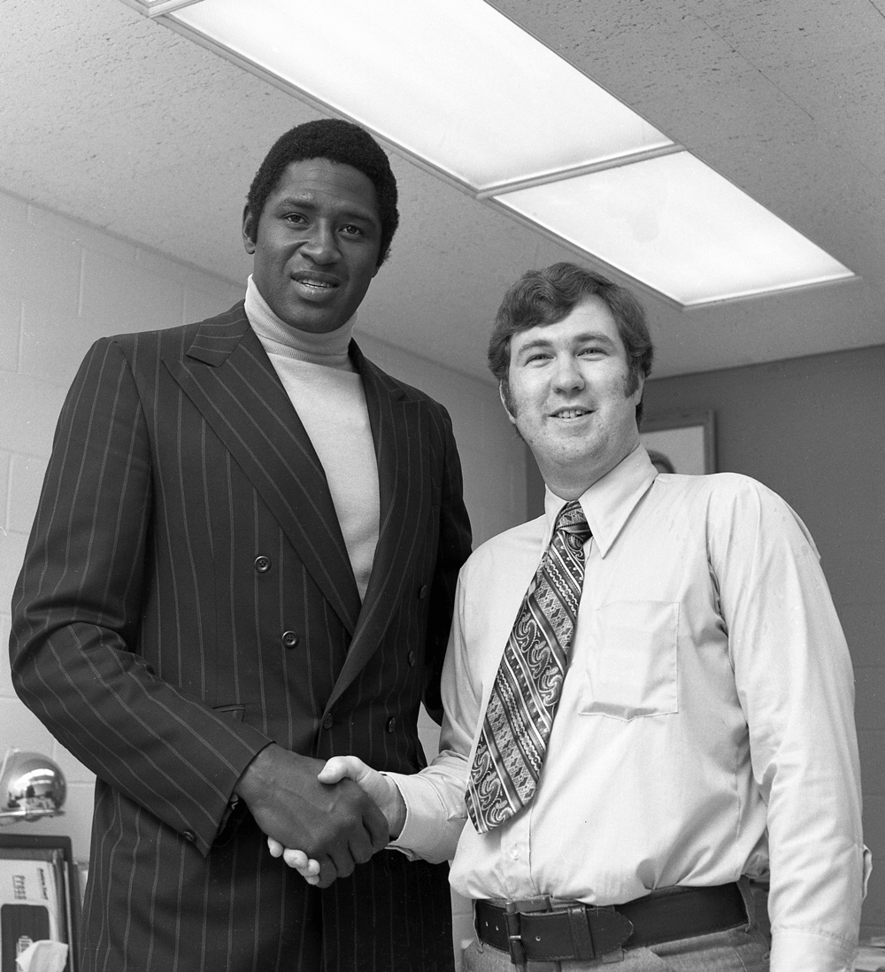 NBA great Willis Reed once played an exhibition game at the WVU Coliseum on Oct. 8, 1971 when the New York Knicks faced Jerry’s West’s Los Angeles Lakers. Here Reed is pictured with WVU sports information director Dick Polen.