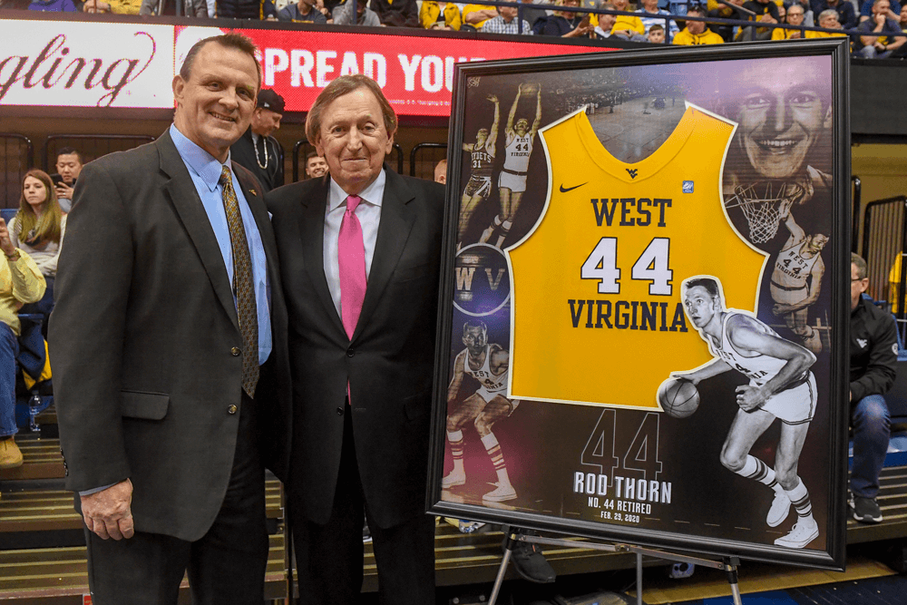 Feb. 29, 2020 – All-America guard Rod Thorn had his jersey No. 44 officially retired prior to West Virginia’s Big 12 men’s basketball game against Oklahoma.